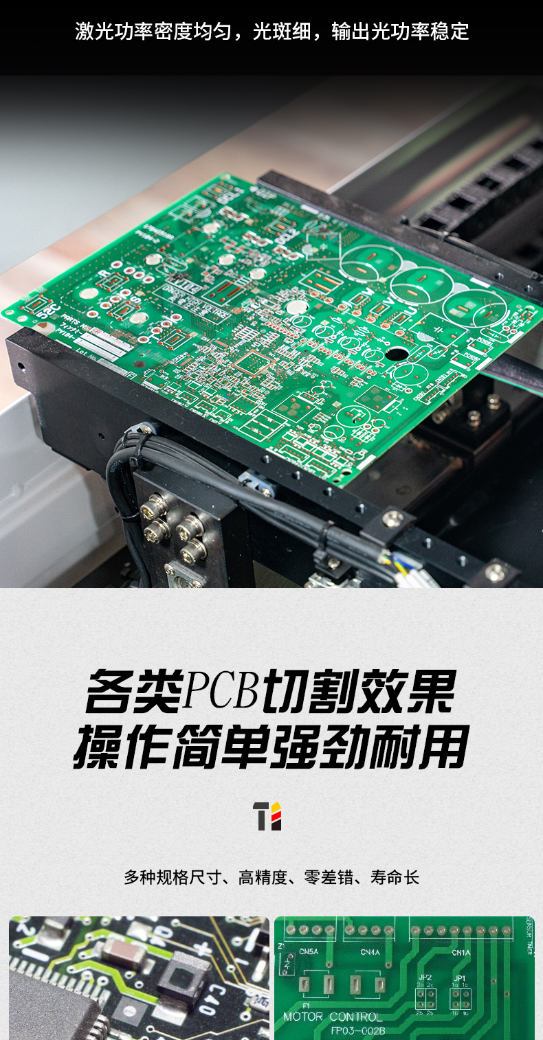 快速將拼板生產(chǎn)的PCB分割成獨立的電路板,加工LTCC,加工半固化片,在FR4上鉆孔、鉆微孔、激光直接成型電路圖形等。紫外激光與其他加工方式或其他激光相比,切割邊緣更整齊,外形尺寸精度更高。產(chǎn)品加工模式無間隙切換,只需點擊軟件菜單導入新加工項目即可。