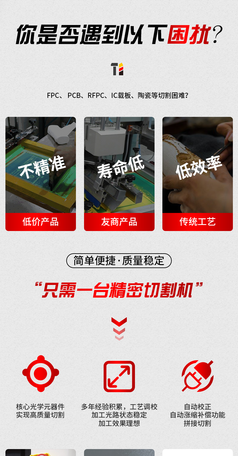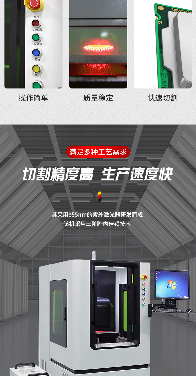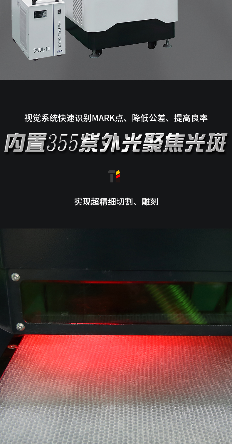 采用UV紫外激光作為工具,冷加工方式,結(jié)構(gòu)緊湊、易安裝、操作簡單,維護方便。幾乎可以加工所有材料,功能強大,精密控制及加工效率極高,是開發(fā)創(chuàng)新產(chǎn)品的好幫手。
