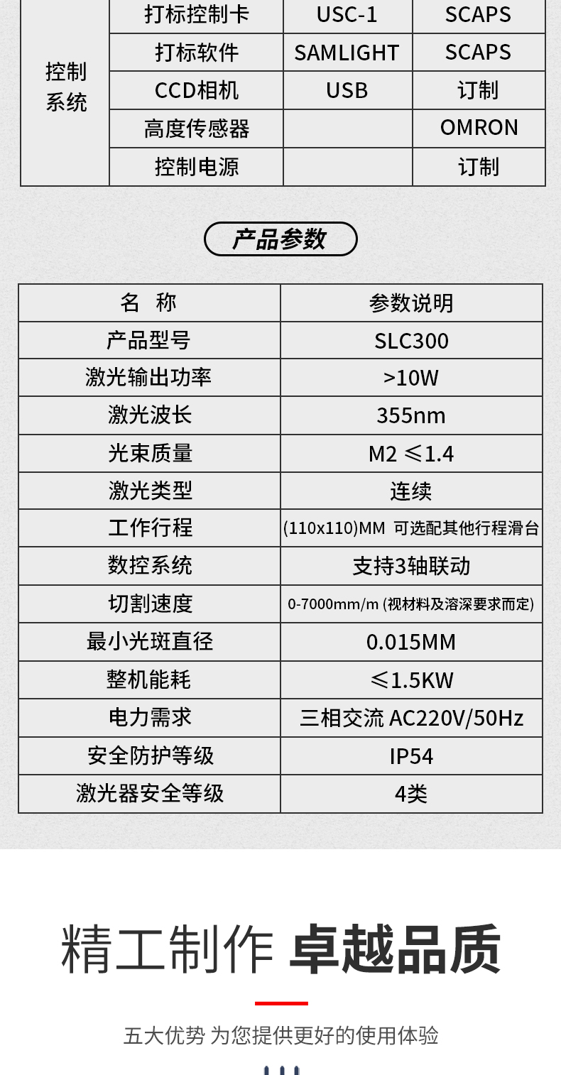 SLC300安裝方便,采用風冷UV紫外激光器,連上吸塵器,介入壓縮空氣,插上電源即可工作 。該設備設計結(jié)構(gòu)緊湊,采用十字滑臺結(jié)合CCD視覺運動控制,達到高速運動并自動捕捉定位產(chǎn)品,效率更高,精度更高。自動調(diào)焦,是工件永遠處于激光焦點范圍內(nèi)。集成的真空吸附平臺,包括軟性材料、柔性材料、薄的基材都能平整的固定。