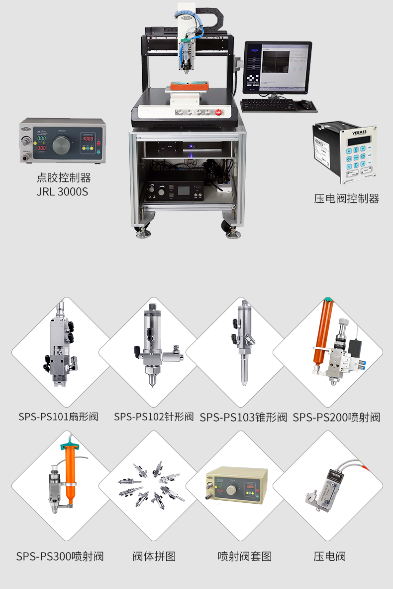 SPS-PS300是一款非接觸式噴射點膠閥,可廣泛應用于表面貼裝膠、導電銀漿、IC封裝膠、底部填充膠、密封膠、表面涂敷膠等各類膠粘劑的可控流量、高速點膠作業(yè)。既能射入小到百微米的狹窄空間,也能在指定位置完成重量到0.01毫克級別的精準點膠。