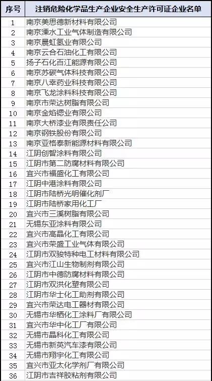 近日,江蘇省應(yīng)急管理廳發(fā)布公告:截止2019年1月11日,全省共有南京美思德新材料有限公司等199家危險(xiǎn)化學(xué)品生產(chǎn)企業(yè)的《危險(xiǎn)化學(xué)品生產(chǎn)企業(yè)安全生產(chǎn)許可證》不在有效期內(nèi),或者在有效期內(nèi)不再?gòu)氖挛kU(xiǎn)化學(xué)品生產(chǎn)活動(dòng)的,一并注銷安全生產(chǎn)許可證,現(xiàn)予以公告。